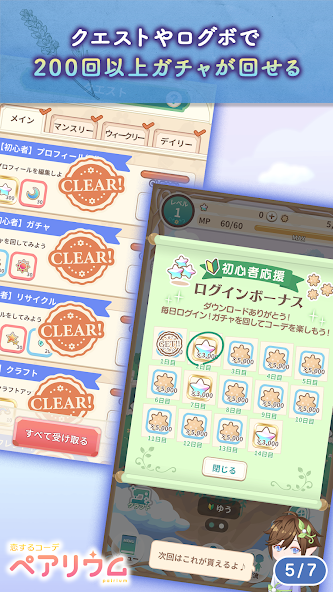 恋するコーデ「ペアリウム」に登録すると、新規ユーザー向けに初回無料ガチャが提供され、無課金プレイヤーのスタートダッシュをサポートします。早めに引くことで序盤に必要な衣装や背景、小物などのアバター素材を大量に確保できるチャンスです。ガチャ結果はリサイクルでガチャチケットやクラフト素材に変換できるので、初動から資源を効率よく回せます。チュートリアル完了や日次任務をこなすことで、初回無料分以降の引き直しにも影響が出る場合があるため、開始直後はタスク消化を優先しましょう。