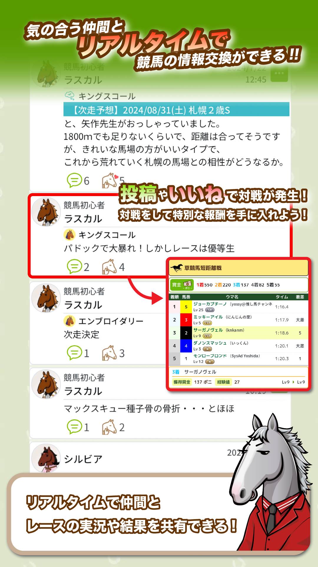 また、SNS連携機能により投稿・いいね・コメントがスムーズに行え、コミュニティでの交流が活発です。自動対戦システムも組み込まれており、仲間とのやり取りがゲーム内バトルへと自然につながる設計が特徴となっています。さらに有馬記念などのリアル競馬主要レースに合わせたイベントが定期的に開催され、レース結果に応じてURウマカードなど豪華報酬が手に入ります。